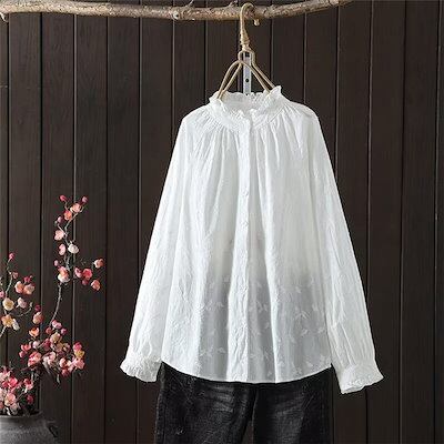 フリル襟 シャツ ブラウス 長袖 立ち襟 刺繍 シャツブラウス レディース トップス 春 秋 フォーマル 大人 可愛い 森ガール ファッション おしゃれ きれいめ ゆったり 体型カバー 重ね着 スーツ