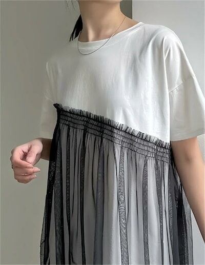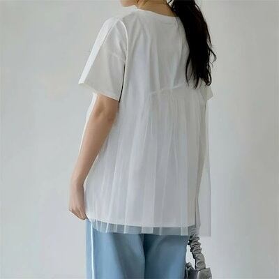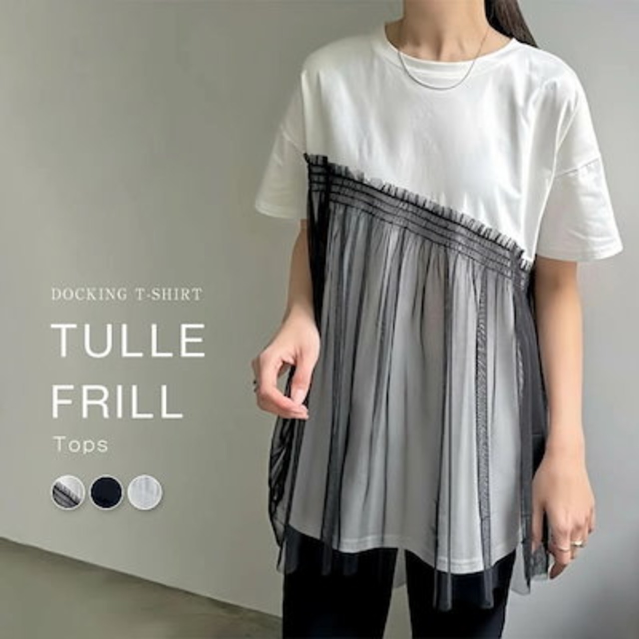 チュール ドッキング トップス レディース クルーネック 半袖 ドッキング カットソー プルオーバー Tシャツ 異素材切り替え チュール フリル 春 夏 半袖 ゆったり 大人フェミニン 半袖 おしゃれ