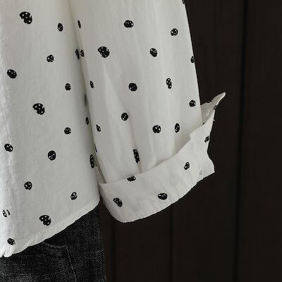 ドット柄 総柄 シャツ 長袖 レディース 襟付き きれいめ フリル 綿 コットン 羽織る 羽織れる トップス レギュラーカラー シャツブラウス ボタン 前開き 柄 ギャザー 体型カバー ゆったり ライ