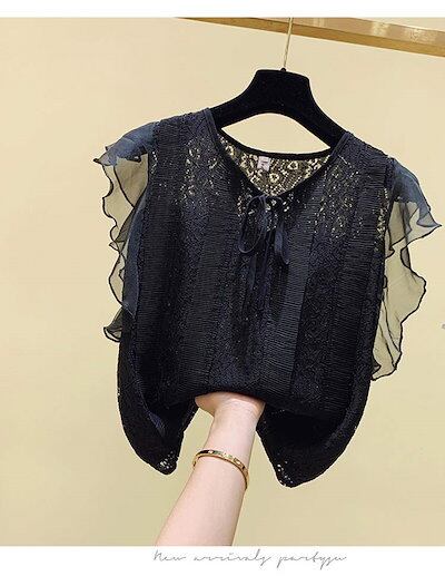 ブラウス レース レディース プルオーバ フレア 透かし編み 紐付き 夏ブラウス フリル ドッキング ふんわり袖 レースブラウス 切り替え 羽織 透け感 クルーネック トップス レーストップス 白 黒