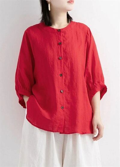 シャツ レディース 綿 麻 ボタン おしゃれ リネンシャツ 半袖シャツ 立ち襟 五分袖 バールン袖 フリル ドルマンスリーブ ドロップショルダ とろみ 春夏 トップス シャツ 大きいサイズ ゆったり