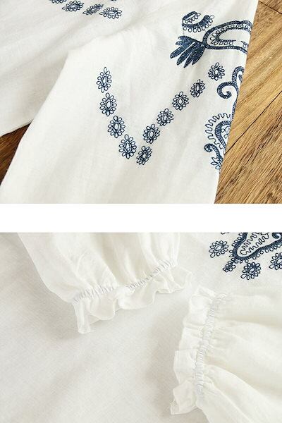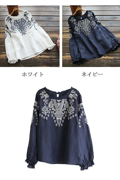 ブラウス レディース 長袖 白 ネイビー シャツブラウス 白ブラウス 刺繍 綿麻 エスニック プルオーバー トップス 袖口ゴムあり フリル袖 可愛い オーバーサイズ シンプル カジュアル風 おしゃれ