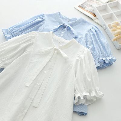 ブラウス 半袖 コットン 半袖シャツ レディース 夏 バンドカラー リボン ブラウス フリル袖 綿シャツ 白シャツ おしゃれ きれいめ ブラウス 細めリボン 仕事 オフィス シャツブラウス 無地 スト