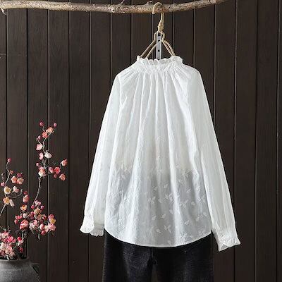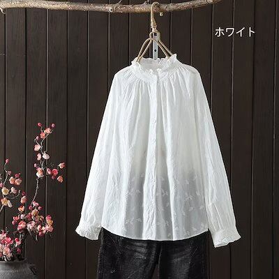 フリル ブラウス 長袖 シャツ 綿 レディース トップス シャツブラウス 長そで 刺繍 花柄 フリルブラウス 立ち襟 入学式 卒業式 通勤 カジュアル 綿シャツ 長袖シャツ きれいめ オシャレ 無地