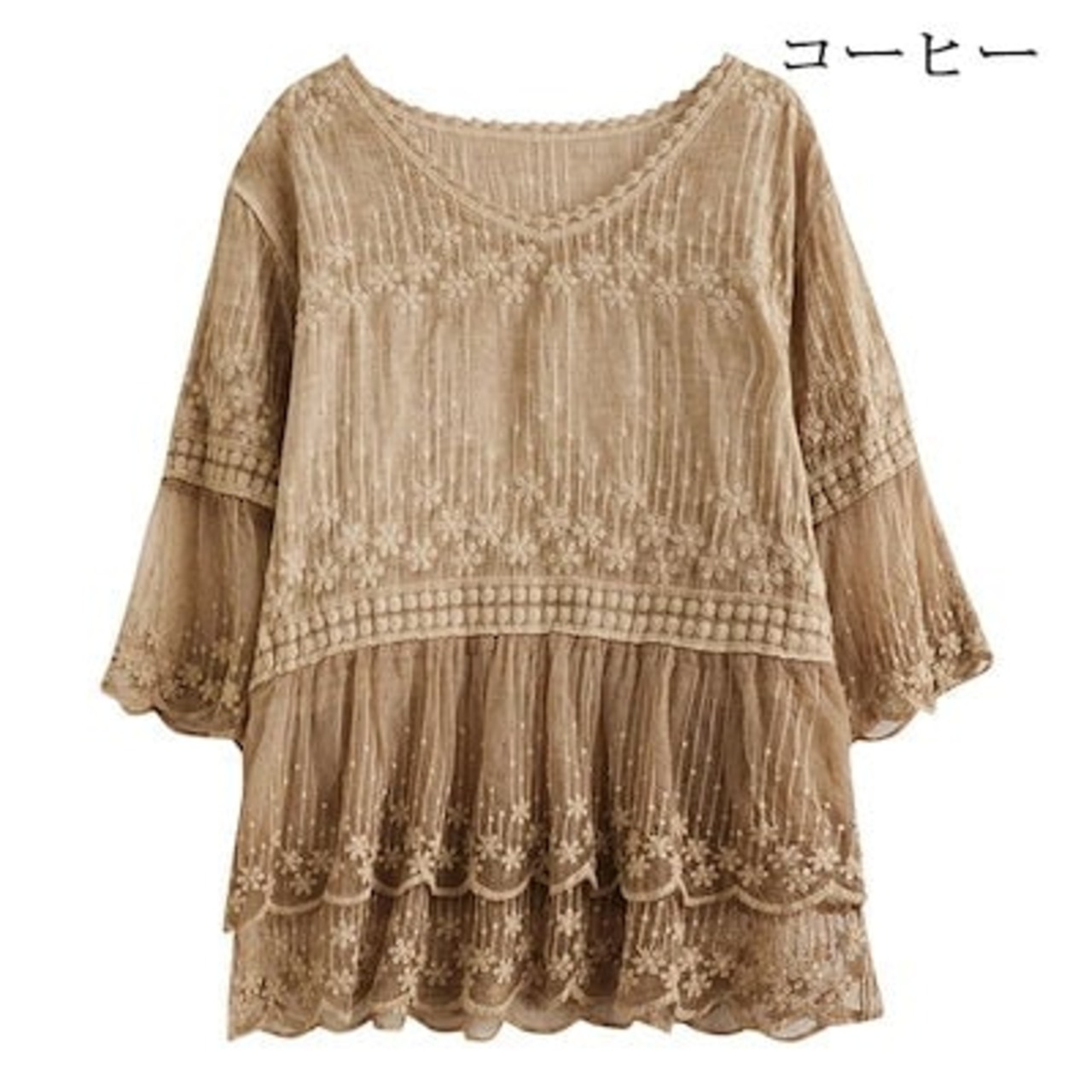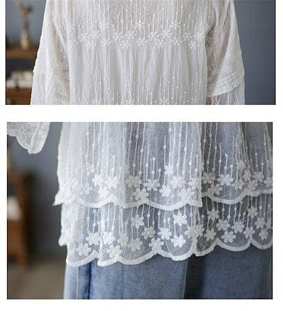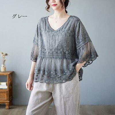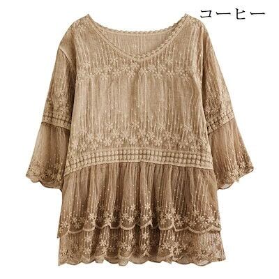 レースブラウス レディース ブラウス レース ブラウス tシャツ カットソー 春夏 花柄 ブラウス 白 フリル Vネック フレア タブル透け感 刺繍 ブラウス シアートップス フレア袖 可愛い 大きい