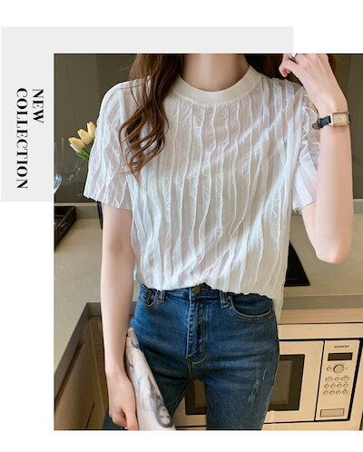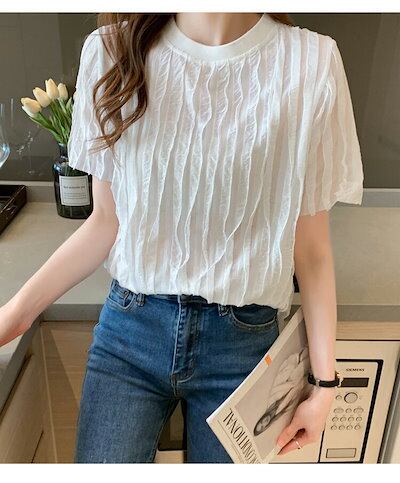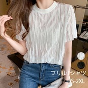 Tシャツ レディース 半袖 トップス カットソー シアー 半袖Tシャツ tシャツ 春 春夏 夏 ラウンドネック 夏服 フリル タック ミドル丈 重ね着 薄手 プルオーバー 体型カバー 透け感 涼しい