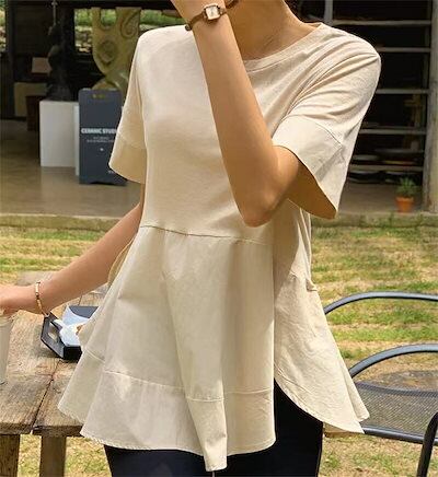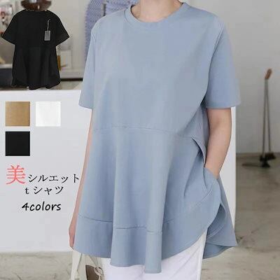 tシャツ レディース 半袖 ゆったり カジュアル 半袖Tシャツ ブラウス フレア バックフリル スリット入り タック ギャザー ラウンドネック トップス レディース 夏 春 無地 カットソー 半袖 レ