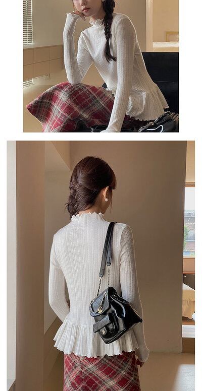 ブラウス ニット フリル裾 レディース 秋冬 ストレッチ 重ね着 長袖 Tシャツ インナー プチハイネック フリル衿 トップス プルオーバー フリルスリーブ レイヤード カットソー 大人可愛い 細見え