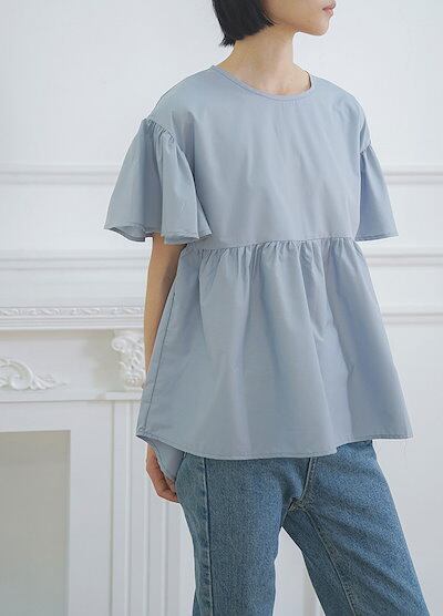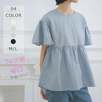 フレア袖 ブラウス 半袖 レディース 春 夏 フリル袖 トップス カットソー チュニック フリル切替 クルーネック ラウンドネック 体型カバー フレアブラウス 無地 シンプル きれいめ カジュアル か