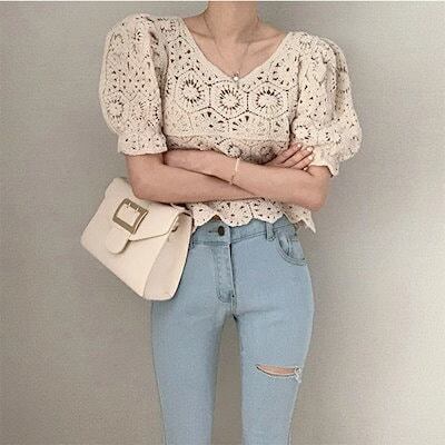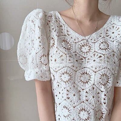 フリル ブラウス レース 半袖 バルーンスリーブ バルーン袖 夏 プルオーバー Tシャツ 花柄 トップス レディース 透かし彫り シースルー 透け感 綿 コットン Vネック 半袖ブラウス 無地 ホワイ
