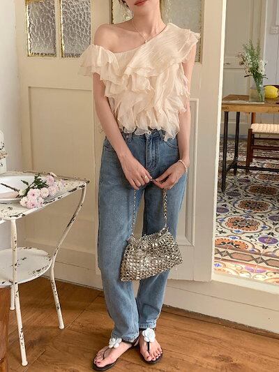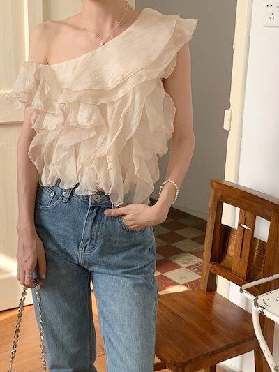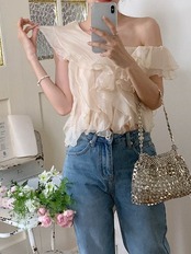 ブラウス オフショルダー レディース フリル袖 オープンショルダー ティアード トップス チュール トップス フェミニン 着回し シンプル おしゃれ 大人 カジュアル こなれ感 トレンド感 春 夏 秋