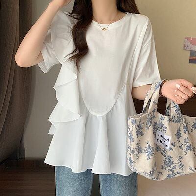 トップス 韓国ファッション フリルブラウス tシャツ ティーシャツ ティシャツ tシャツ 半袖 チュニック イレギュラー 体型カバー カットソー 韓国レディース半袖 大きいサ ロゴT