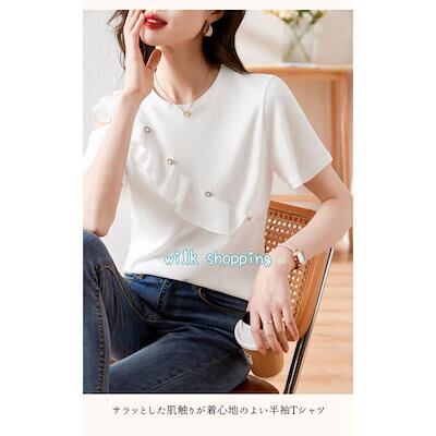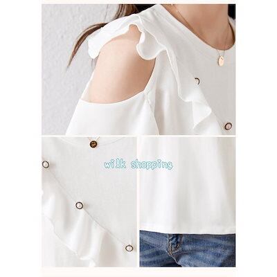 Tシャツ 半袖 レディース 切り替え フリル 肩出し アシンメトリー プルオーバー トップス カットソー 春 夏 オフィスカジュアル