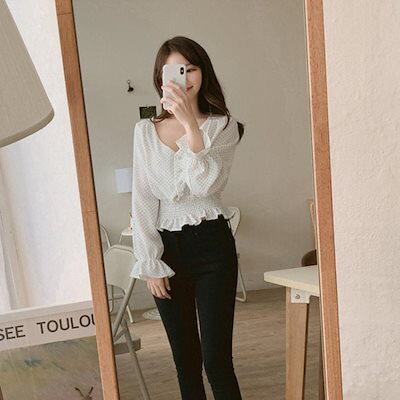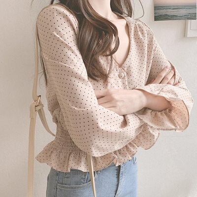 【本日限定】気質 韓国ファッション 長袖シャツ ドット柄ブラウス レディース 長袖 フリル ブラウス 春 おしゃれ 韓国風 シフォン トップス ウエストギャザー ネック
