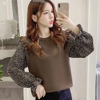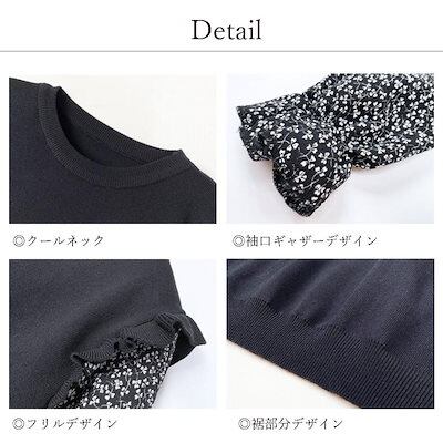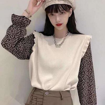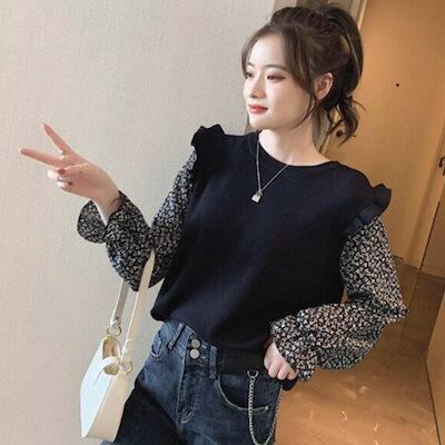 【本日限定】気質 韓国ファッション 長袖シャツ 小花柄 ドッキングニット レディース レイヤード風 ニットブラウス クールネック フリル ニットトップス ギャザー おしゃれ