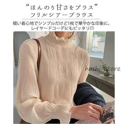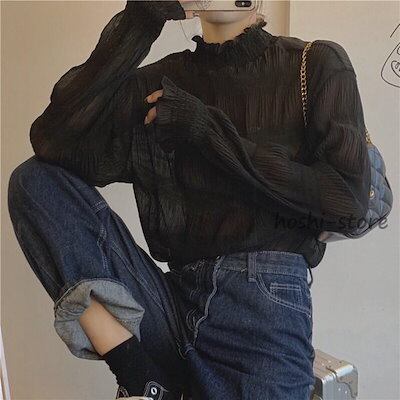 【新作入荷】気質 長袖シャツ ブラウス 春 シフォン シャーリング ギャザー レディース シアー レース トップス シアートップス レイヤード ハイネック フリル フレア袖