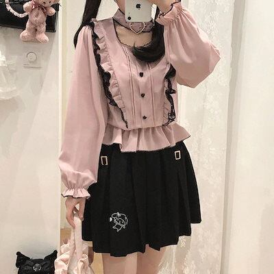 2025新入荷地雷スタイルパールラブロリータネックラインロリータシャツ レディースブラウス レディース レースウエストトップシャツ レディース