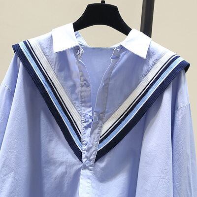ブラウス シャツ レディース シアーシャツ レイヤード ブルーコットン 長袖 シャツ レディース 新作 韓国版ゆったりシャツカジュアルキルティングボーダーニットトップスボトム