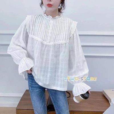 新品推奨,レディース ブラウス シャツ 長袖 ハイカラー パフスリーブ ランタンスリーブ バルーン袖 無地 フリル トップス プルオーバー ゆったり フェミニン スウィート
