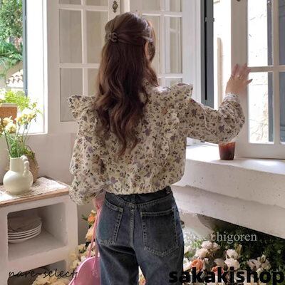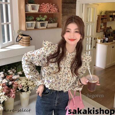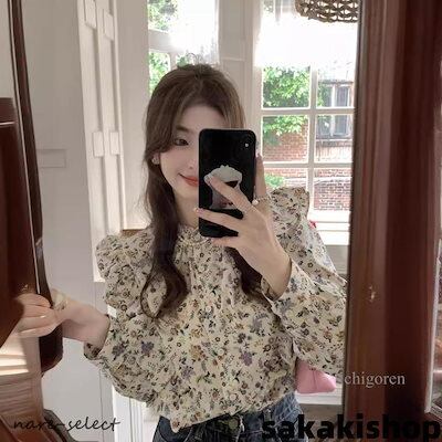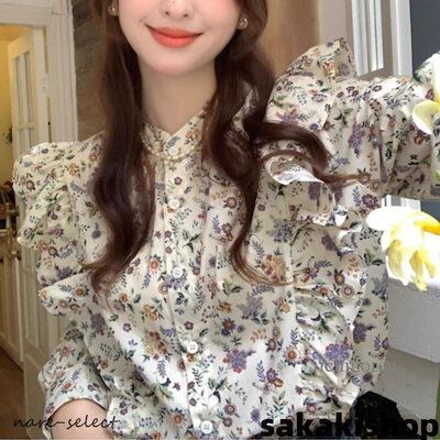 今月限り,シャツ ノーカラーシャツ 長袖 フリル 小花 フラワー 柄 総柄 レディース 韓国ファッション レトロ きれいめ ガーリー フェミニン 春 かわいい 秋