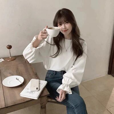 シフォンシャツ3日送信シフォンシャツ3日送信シャツトップスパフスリーブ可愛い 長袖 ラウンドネックフリル袖口無地レディースゆったりカジュアル着痩せ