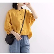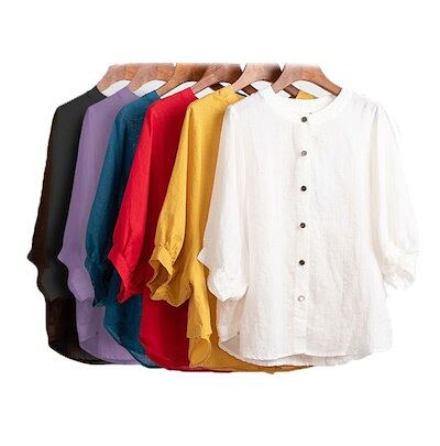 レディースファッション コットンンシャツ リボンブラウス 大きいサイズ 綿麻Tシャツ7分丈 ベスト6カラー前開き トップスフリルブラウス 無地 体型カバー 長袖 T