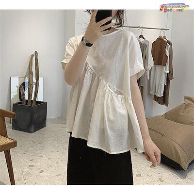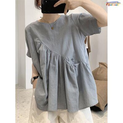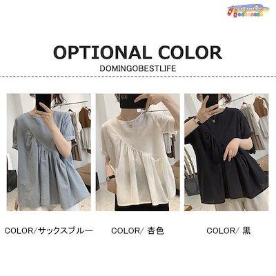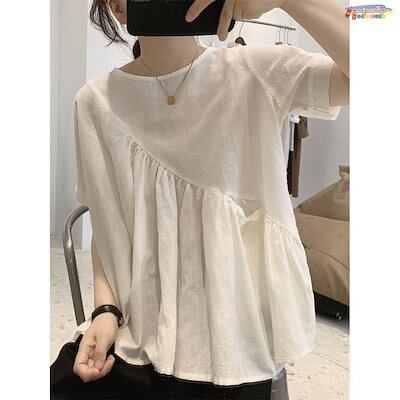 シャツ ブラウス レディース フリル 切り替え クルーネック 丸首 トップス 大きいサイズ ゆったり 半袖 ギャザー 無地 おしゃれ きれいめ 大人可愛い デザイン