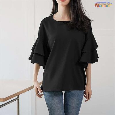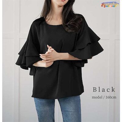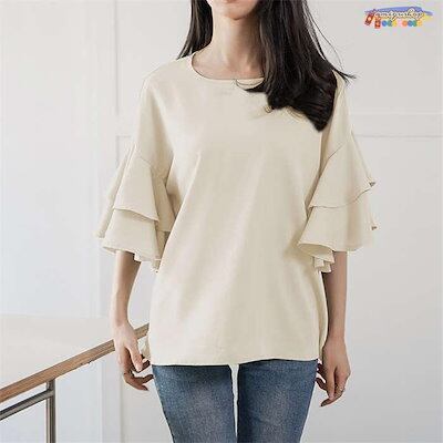 ラッフルスリーブ ブラウス シャツ ラッフル レディース 夏 半袖 七分袖 きれいめ 羽織 フリル フレアスリーブ ラウンドネック 丸首 トップス フレアブラウス