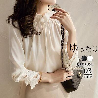 ブラウス レディース シャツ 長袖 レース シフォン 綿 フリル シースルー ック 無地 ゆったり 花柄 薄手 フェミニン 通勤 感