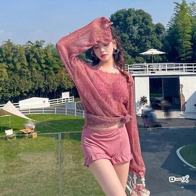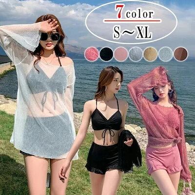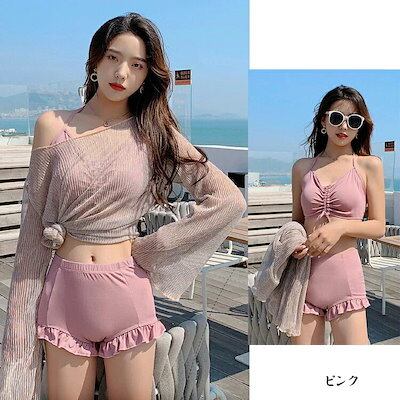 [cos衣料]水着 レディース ビキニ ショートパンツタイプ シースルートップス フリル ブラック ホワイト ベージュ ピンク ブラウン 上下 セパレート 大きいサイズ かわいい 上下別 セット ビー
