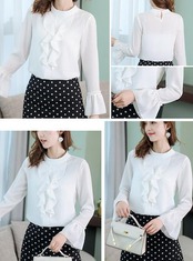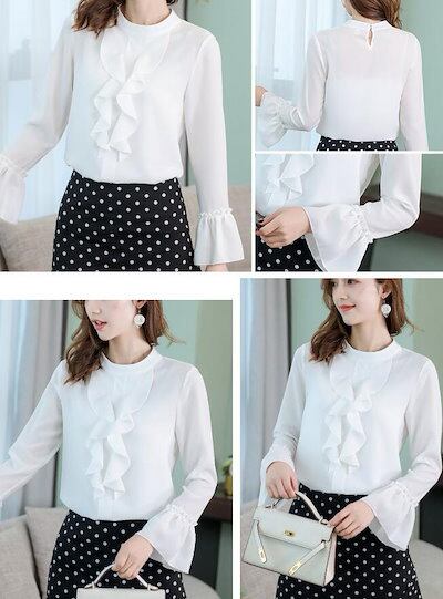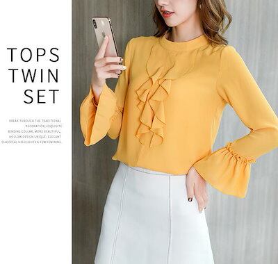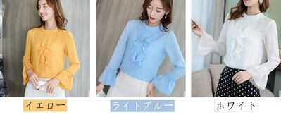 ブラウス シャツ クルーネック フリル フレア リボン 風 フリルブラウス フェミニン 可愛い レディース 胸元 長袖 大きいサイズ 卒業式 卒園式 オフィス OL おしゃれ 薄手 S M L