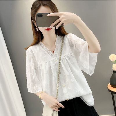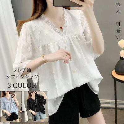 リボン ブラウス リボン マウンテンパーカー シアーシャツ カーディガンシフォン 大人気 フレア袖 レディース 半袖 トップス Tシャツ 可?い ゆったりした シアーシャツ UVカット 夏服