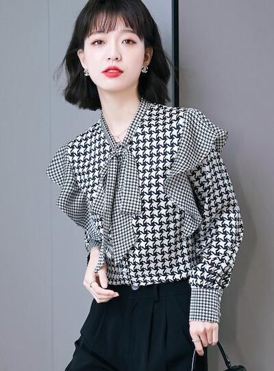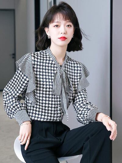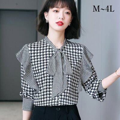 ブラウス シャツ リボンブラウス ボウタイ フリル レディース シフォン スーツ インナー 胸元 長袖 チェック 千鳥柄 大きいサイズ 通勤 卒業式 卒園式 オフィス おしゃれ M L 2L 3L
