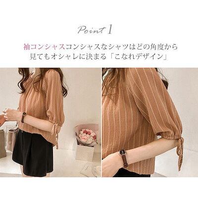 ブラウスレディース2wayオフショルダーノーカラー五分袖パフスリーブリボンシフォンストライプ大きいサイ