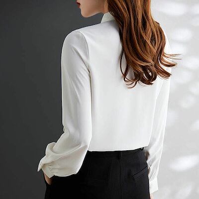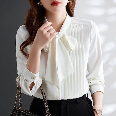 シャツブラウスレディース長袖白きれいめ秋ギャザーシフォンブラウスジョーゼットフリルリボン付きシャツブラウスオフィスビジネストップスフォーマルカジュアルファッション体型カバー着?せ通勤無地シンプル着回し