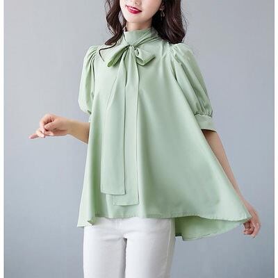 ブラウス レディース 半袖 パフスリーブ ノーカラー ハイネック リボン フォーマル 春夏 パフスリーブリボンフレアブラウス
