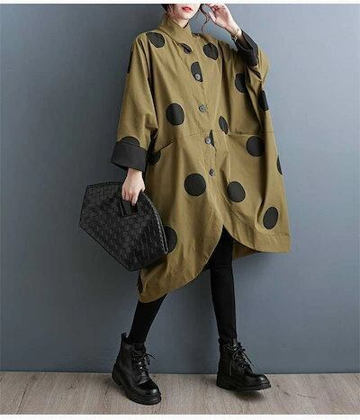 コート レディース 春秋 トップス カーディガン ポケット付き 総柄 ドット柄 前開き 羽織り ボタン 立ち襟 ロングコート ロング丈 ドットコート カジュアル シンプル アウター レイヤード 重ね着