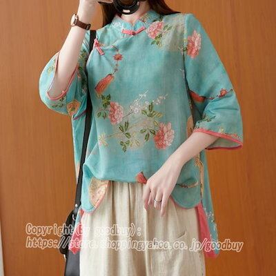 リネンブラウス 立ち襟 チャイナボタン レディース 民族風 リネントップス 花柄 カジュアル 文芸