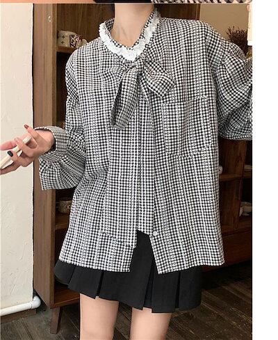 ボウタイブラウス レディース シャツ レース ブラウス 長袖 ギンガムチェック ボウタイ トップス 前ボタン チェック シャツブラウス ゆったり 大きいサイズ シンプル カジュアル 大人 可愛い きれ