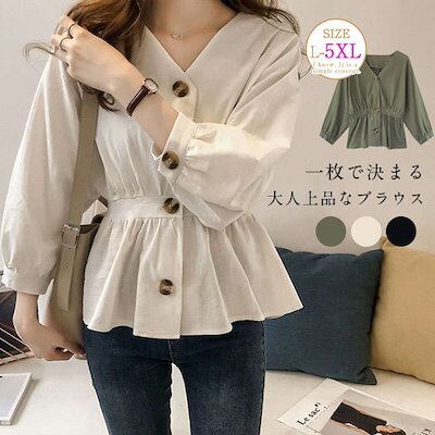 ブラウス レディース 長袖ブラウス 春秋 オフィスブラウス 秋 長袖 トップス Vネック フロントボタン 可愛い 大人 上品 前ボタン フレア ブラック 黒 カーキ ホワイト 白 ウエストマーク 細見
