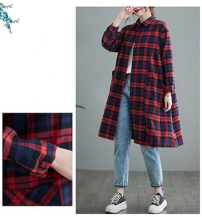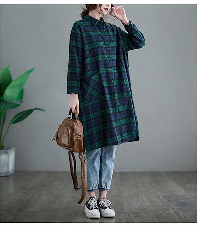 ロングシャツ チェック シャツチュニック レディース 春秋 長袖 シャツカーディガン 2way チェックシャツ トップス ロングシャツ バックボタン ポケット カジュアル スタンダードカラー 通勤 オ