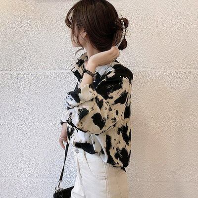 長袖 シャツ レディース ウシ柄 ボタン vネック 2021春秋 新作 プリント ゆったり 韓国ファッション