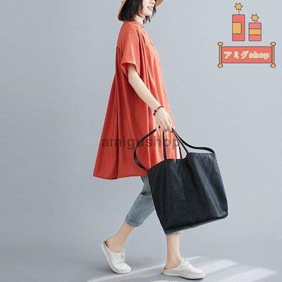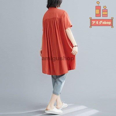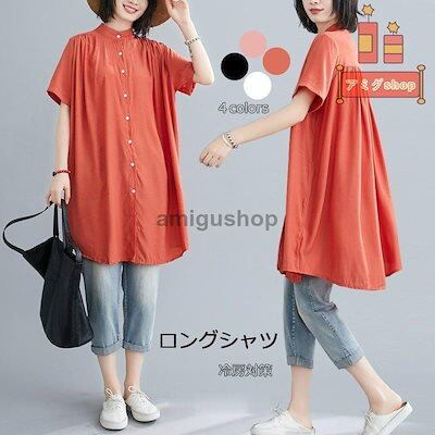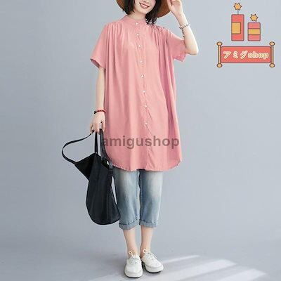 安いシャツ レディース 夏 トップス 無地 チュニック ボタン止め フレアシルエット ギャザー入り 立ち襟 ゆったり コットン 半袖 着まわし 春 50代 40代 30代 20代