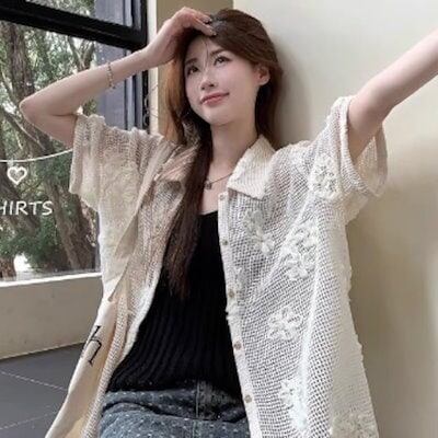 2025春夏トップス カーディガン 羽織 透かし彫り 花柄 ボタン 襟 半袖 ゆったり 細見え 夏 白 ホワイト カジュアル おしゃれ かわいい キュート 韓国ファッション レディース お出かけ