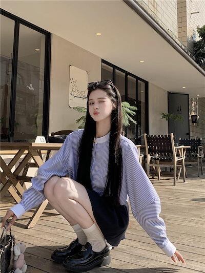 2025春夏トップス シャツ 長袖 ストライプ ボタン 襟 スタンダードカラー 秋 青 ブルー おしゃれ かわいい 韓国ファッション レディース お出かけ