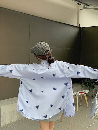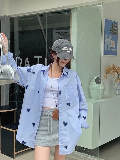 2025春夏トップス シャツ 長袖 ボタン 襟 スタンダードカラー ハート 秋 ブルー 青 おしゃれ かわいい ガーリー キュート ラブリー 甘め 韓国ファッション レディース お出かけ