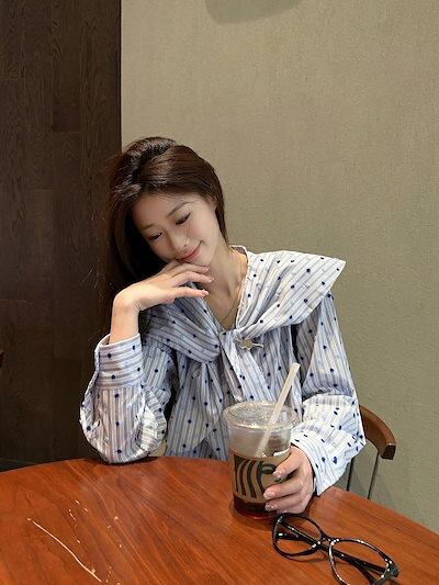 2025 春夏トップス シャツ 長袖 ストライプ ボタン 襟 ピューリタンカラー セーラー襟 リボン 秋 青 ブルー おしゃれ かわいい 韓国ファッション レディース お出かけ