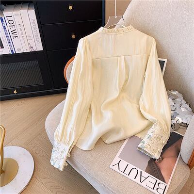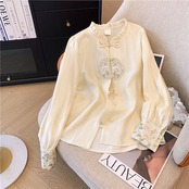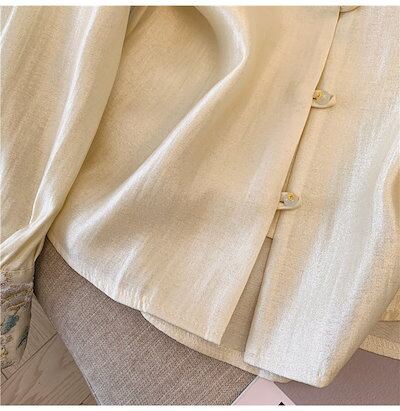 新作】ニューチャイナ 刺繍前開きシャツ レディースフリル付きスタンドカラー 高級感国風トップス 春秋用 チャイナボタン&マーミアンスカートコーデ例