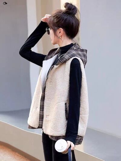 期?限定!中綿 ジャケット 極暖 ジャケット ウエストコートレディース2025春と秋の新しい緩いフード付きスプライシング羊ウエストコートジャケット女性