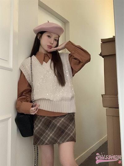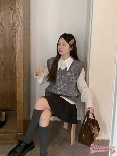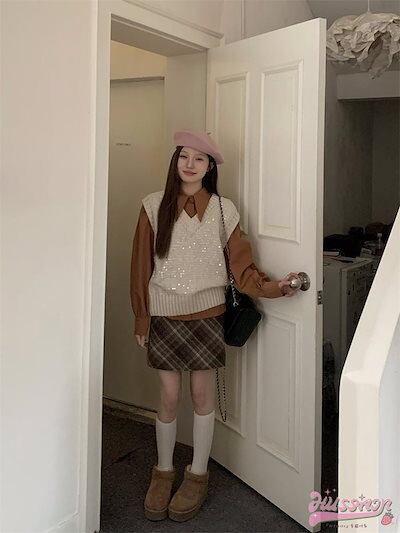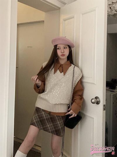 トップス ベスト ニット セーター Vネック スパンコール キラキラ ゆったり 白 春 韓国ファッション レディース おしゃれ かわいい カジュアル お出かけ